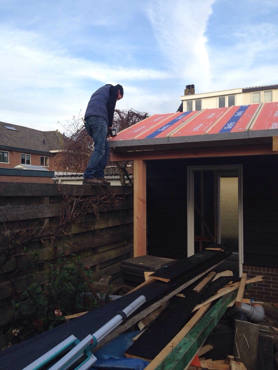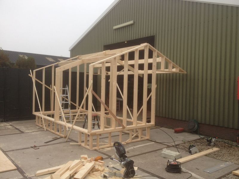 Het geraamte van de schuur is voorbereid in de werkplaats. Waarna hij geplaatst is bij de klant en afgemaakt.
